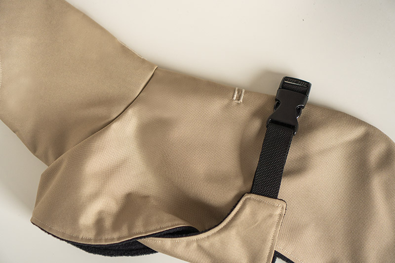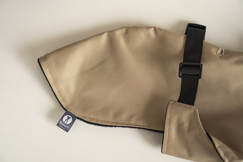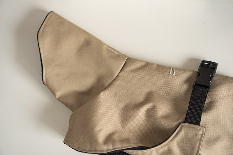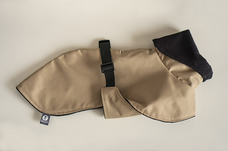 Kurtka lekka w beżowym kolorze dla psów rasy chart angielski. Jest zrobiona z nieprzemakalnego materiału na wierzchniej części i cienkiego polaru wewnątrz. Sprawdza się doskonale na deszczowe i wietrzne dni. Kurtka posiada długi golf, który służy także jako kaptur, i który można wywinąć, aby odsłonić głowę psa. Pod brzuszkiem znajduje się panel z regulowanymi paskami zakończonymi zapięciem. Ubranko ma dwa otwory na przypięcie smyczy: do obroży lub do szelek. Łatwo się zakłada, wystarczy przełożyć przez głowę i zapiąć plastikowy zatrzask na plecach. Dopasuj rozmiar do swojego psa – sprawdź tabele rozmiarów.