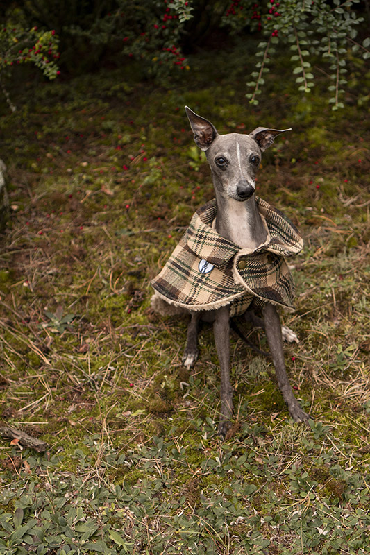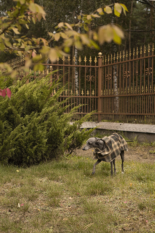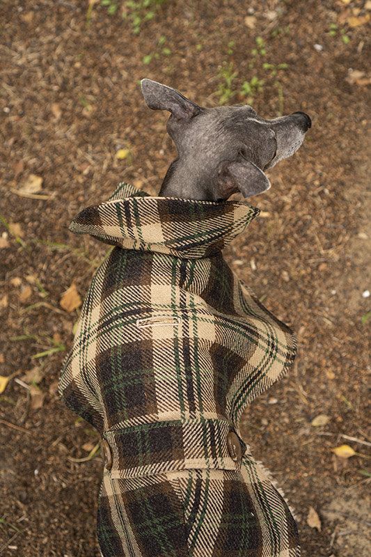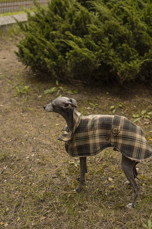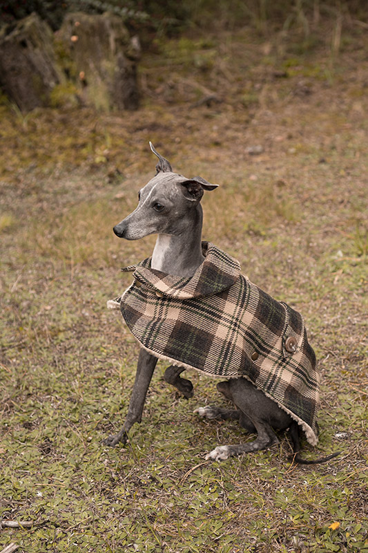 Charcik włoski w płaszczu w kratę, bezowo brązowo zielonym. Płaszczyk dla psa