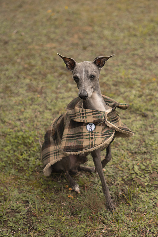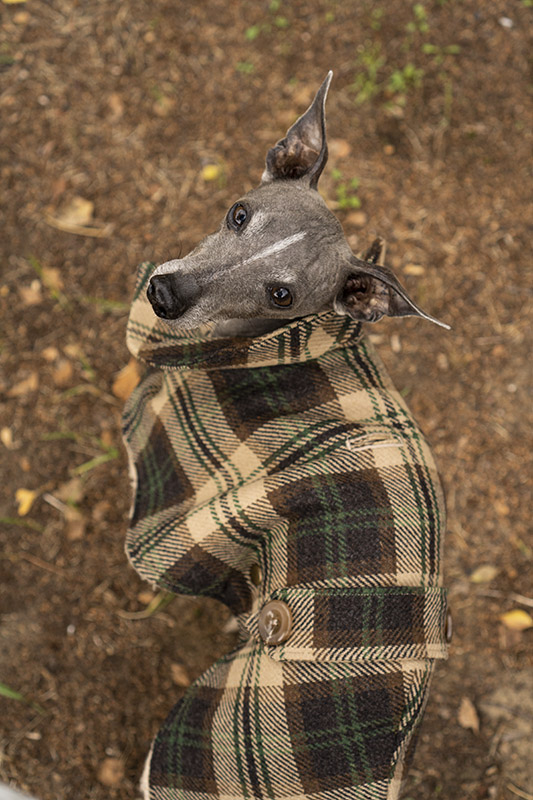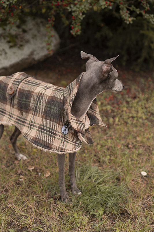 Płaszcz  w elegancki wzór w kratę dla psów rasy chart angielski. Jest zrobiony z materiału z wełną 100% na wierzchniej części i ciepłego futerka wewnątrz. Sprawdza się doskonale na zimową porę roku. Płaszczyk posiada kołnierz, który można postawić do góry lub położyć. Pod brzuszkiem znajduje się panel przypinany do derki na napy. Ubranko ma dwa otwory na przypięcie smyczy: do obroży lub do szelek. Łatwo się zakłada, wystarczy położyć na plecach i przypiąć napy przy szyi i na brzuchu. Dopasuj rozmiar do swojego psa – sprawdź tabele rozmiarów. Jeśli masz psa innej rasy – napisz do nas. Szyjemy także na wymiar.